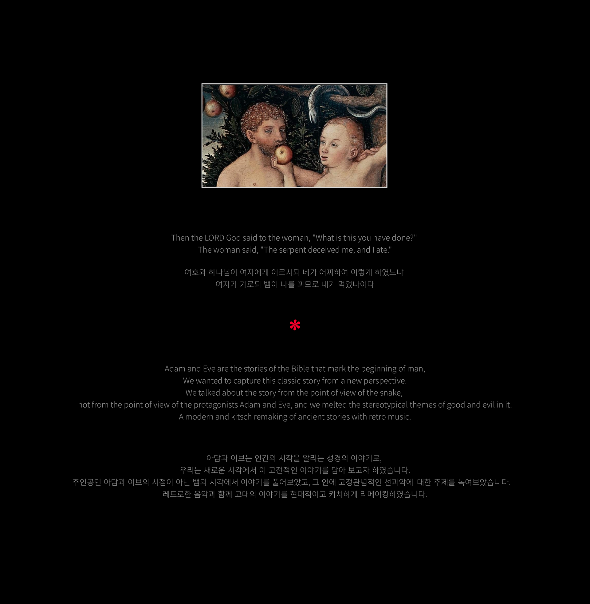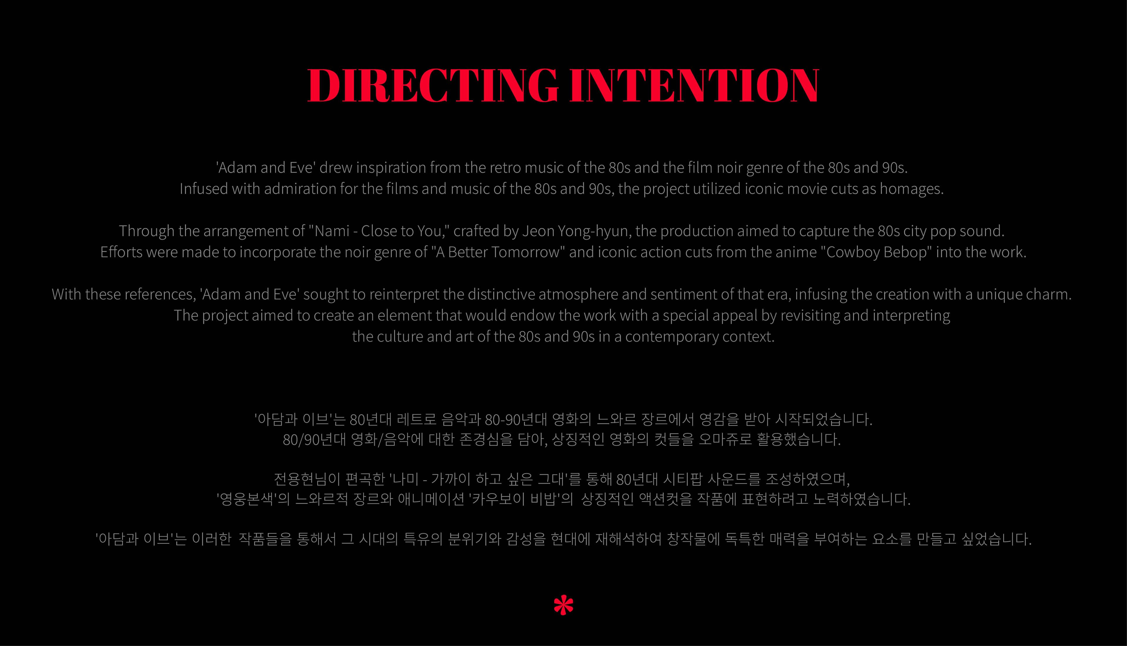 'Adam and Eve' drew inspiration from the retro music of the 80s and the film noir genre of the 80s and 90s. Infused with admiration for the films and music of the 80s and 90s, the project utilized iconic movie cuts as homages.